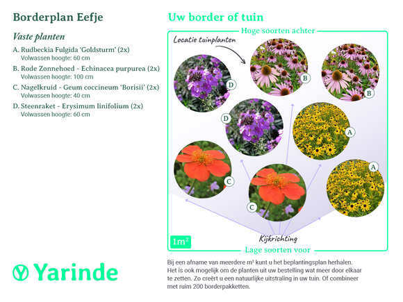 Houdt u van kleur in de tuin en ziet u elk jaar graag een kleurenexplosie aan bloeiende vaste planten? Dan zijn de kant-en-klare borderpakketten kleurrijk iets voor u. U ontvangt per m2 8 vaste planten die bloeien in de kleuren geel - roze - oranje - paars. Dit plantpakket is geschikt voor mensen zonder groene vingers en kan worden aangeplant in geveltuintjes en verhoogde borderbakken. Bestel in meervoud of combineer met andere borderpakketten van Yarinde.