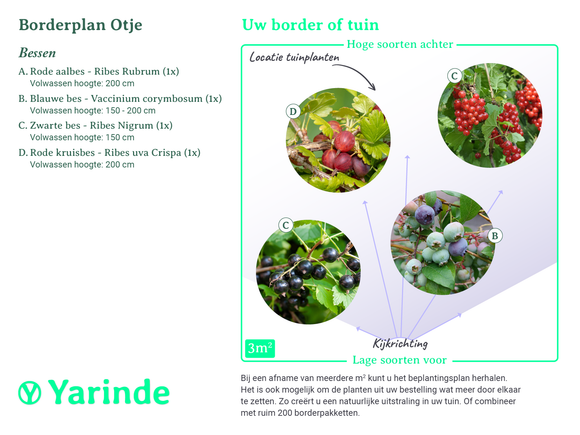 Afhankelijk van de maand waarin u bestelt staan de planten in bloei, dan wel vruchtdragend. De bessenstruiken zijn niet wintergroen dus in het najaar zullen de bladeren afsterven waarna ze in het voorjaar weer uitlopen en groeien. Deze 4 struiken in dit fruitpakket zijn goed voor zeker 3 tot 4m2 . Voor u bestelt reken, net als bij kant en klare borderpakketten eerst uw plantenvak uit (lengte x breedte). Mocht u meer nodig hebben dan is het mogelijk om het aantal bessenstruiken te ontvangen om uw gehele plantvak op te vullen. Voorbeeld: bij een bestelling van 4 m2 of meer ontvangt u bessenstruiken in meervoud. U kunt dan bij de bestelling zelf aangeven welke struik(en) u graag vaker zou willen ontvangen. Op deze manier kunt u de kant en klare fruitpakketten van Yarinde ook eenvoudig met elkaar combineren.