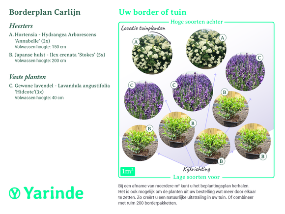 Een eenvoudig, maar werkelijk prachtig Yarinde Borderpakket. Dit kant-en-klare borderpakket bestaat uit 3 verschillende soorten met allemaal hun eigen sierwaarde. Met in de hoofdrol speler de Hortensia 'Annabelle'. Beroemd vanwege haar prachtig, enorme bloemen van maar liefst 50 cm. Deze rijkbloeiende struik plant u achteraan in uw tuin of tuinborder, vervolgens plant u de lavendel rondom en Japanse hulst aan de rand van uw tuin of border als haagje eromheen.
