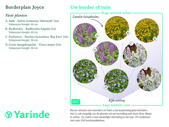Geen groene vingers? Zoekt u een mooie plantenmix voor in een plantenbak of verhoogde border? Dan is dit kant en klare borderpakket Joyce iets voor u. Borderpakket Joyce bestaat uit 4 verschillende soorten die bloeien in de kleuren paars en geel. Deze combinatie geeft de tuin, tuinborder of plantenbak veel kleur en contrast. Dit borderpakket besteld u gemakkelijk per m2. De heerlijk geuren van de Salie, de bijzondere vormen van de Rudbeckia en de schitterende structuren van het Ezelsoor maken dit pakket tot een favoriet in uw border, bloempot, tuin, perk, terras of balkon. Met de Grote maagdenpalm geniet u al vroeg in het jaar van paarse bloemen. Deze bodembedekker is groenblijvend.